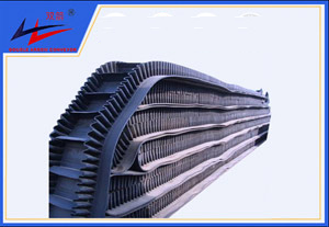 大傾角波狀擋邊輸送帶又叫裙邊隔板輸送帶,是由基帶、擋邊、橫隔板3部分組成。擋邊起防止物料側(cè)滑撒落的作用。為便于繞過(guò)滾筒,擋邊設(shè)計(jì)成波紋狀,橫隔板的作用是承托物料,為實(shí)現(xiàn)大傾角輸送,采用T型TC型。本公司生產(chǎn)的波狀擋邊輸送帶擋邊和橫隔板是用二次硫化的方法與基帶連接的,具有很高的連接強(qiáng)度。