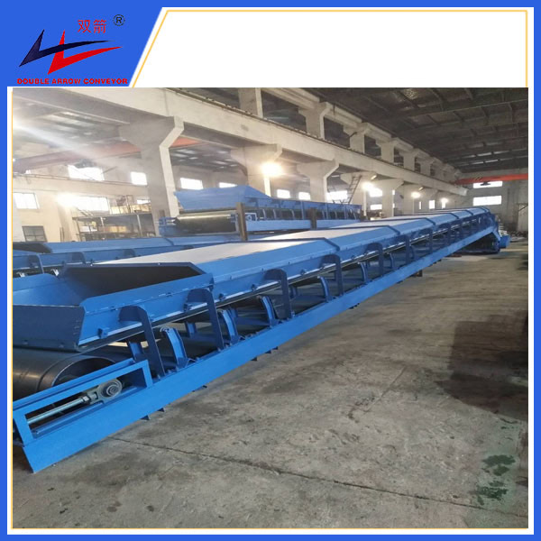 江蘇雙箭-大傾角皮帶輸送機 大傾角皮帶輸送機具有通用帶式輸送機結構簡單,運行可靠,維修方便等優點,并具有大傾角輸送、結構緊湊、占地少等特點,因而是大傾角輸送和垂直提升物料的理想設備。大傾角皮帶輸送機的特別之處是采用波狀擋邊輸送帶來取代普通輸送帶。它的工作原理和結構組成,與通用帶式機相同。因此,像傳動滾筒、拖輥、拉緊裝置、中間機、中間架支腿、尾架、卸料漏斗、頭部護罩、空段清掃器、保護裝置等部件,都可以與通用帶式輸送機的相應部件通用。 結構: 波狀擋邊輸送帶:在輸送機中起曳引和承載作用。波狀擋邊、橫隔板和基帶形成了輸送物料的"閘"形容器,從而實現大傾角輸送。 驅動裝置:是輸送機中的動力部分。系由Y系列電動機,ZJ型軸裝式減速器,楔塊式逆止器組成。 傳動滾筒:是動力傳遞的主要部件,輸送帶借其與傳動滾筒之間的摩擦力而運行。本系列傳動滾筒有膠面和光面之分,膠面滾筒是為了增加滾筒和輸送帶之間的附著力。 改向滾筒:用于改變輸送帶的運行方向。改向滾筒用于輸送帶下表面(非承載面)。 壓帶輪:用于改變輸送帶的運行方向,壓帶輪用于輸送帶上表面(承載面)。 托輥:托輥用于支承輸送帶和帶上的物料、使其穩定運行。本系列有上平行托輥、下平型托輥兩種型式。 托帶輥:托帶輥用于在凸弧段機架上支承輸送帶下分支,其支承于擋邊輸送帶兩側的空邊上。若干組托帶輥形成一個圓弧段用于使輸送帶改向。托帶輥采用懸臂支承。 立輥:立輥用于限制輸送帶跑偏,并安裝在上、下過度段機架上。每個過濾段機架上設有4個,上、下分各兩個。 拍打輪清料裝置:用于拍打輸送帶背面,震落粘在輸送帶上的物料。 拉緊裝置:它的作用有:1.使輸送帶具有足夠的張力,保證輸送帶和傳動滾筒間不打滑。2.限制輸送帶在各支承間的垂度,使輸送機正常運轉。本系列采用螺旋拉緊裝置。 機架、頭部漏斗、頭部護罩、導料槽、中間架、中間架支腿等:在輸送機中分別起支承、防塵和導料作用。本系列中間架支腿有低式、中式和高式三種。下水平段和傾斜只配用低式中間架支腿,而上下水平段根據不同的頭架(低式、中式和高式頭架)分別配用不同的中間架支腿(低式、中式和高式中間架支腿) 適用范圍: ①、可以廣泛用于煤炭、糧食、建材、建筑、冶金、電力、化工和輕工等行業 。 ②、可在-25~40℃的環境范圍內輸送堆積密度為0.5-2.5t/m3的各種散裝物料。 ③、可輸送角度達90°,可輸送物料的塊度達550mm。